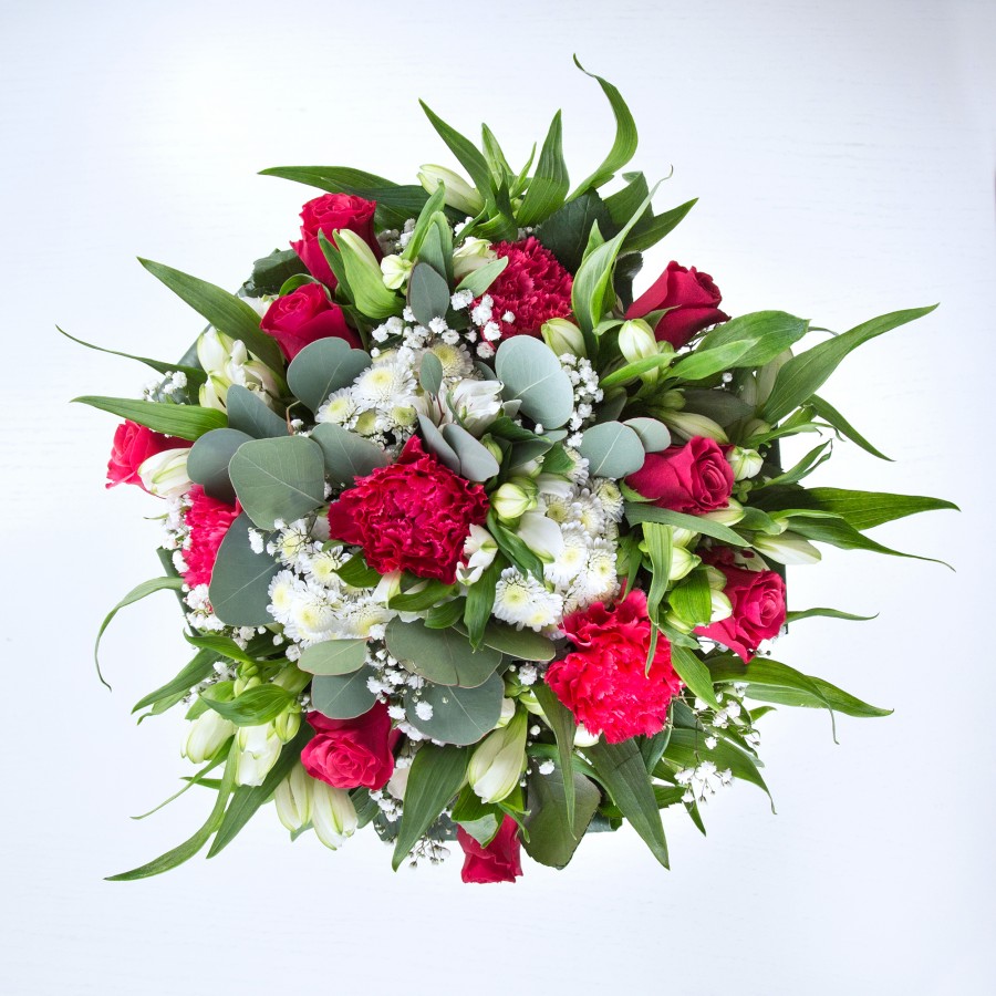 Celebrate moments of joy with our Serene Beauty Bouquet. This unique arrangement showcases the delicate white chrysanthemums and gypsophila, enhanced by the vibrant red roses and carnations, all elegantly combined with white alstroemeria and aspidistra leaves to create a harmonious display.